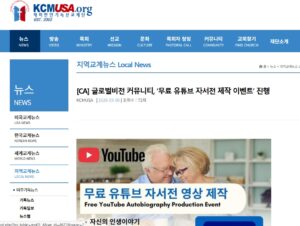- KCMUSA [CA] 글로벌비전 커뮤니티, ‘무료 유튜브 자서전 제작 이벤트’ 진행작성자KCMUSA| 작성일2026-03-09 글로벌비전 커뮤니티(대표 제임스 구)는 개인의 삶과 이야기를 영상으로 기록하는 “무료 유튜브 자서전 영상 제작 이벤트”를 진행한다고 밝혔다. 이번 이벤트는 자신의 인생 이야기, 신앙 간증, 이민 스토리, 인생의 전환점,… Read more: KCMUSA [CA] 글로벌비전 커뮤니티, ‘무료 유튜브 자서전 제작 이벤트’ 진행