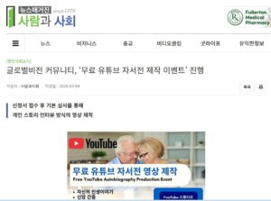 - [사람과사회]글로벌비전 커뮤니티, ‘무료 유튜브 자서전 제작 이벤트’ 진행작성자 : 사람과사회 : 2026-03-04 신청서 접수 후 기본 심사를 통해 개인 스토리 인터뷰 방식의 영상 제작 글로벌비전 커뮤니티(대표 제임스 구)는 개인의 삶과 이야기를 영상으로 기록하는 “무료 유튜브 자서전 영상… Read more: [사람과사회]글로벌비전 커뮤니티, ‘무료 유튜브 자서전 제작 이벤트’ 진행