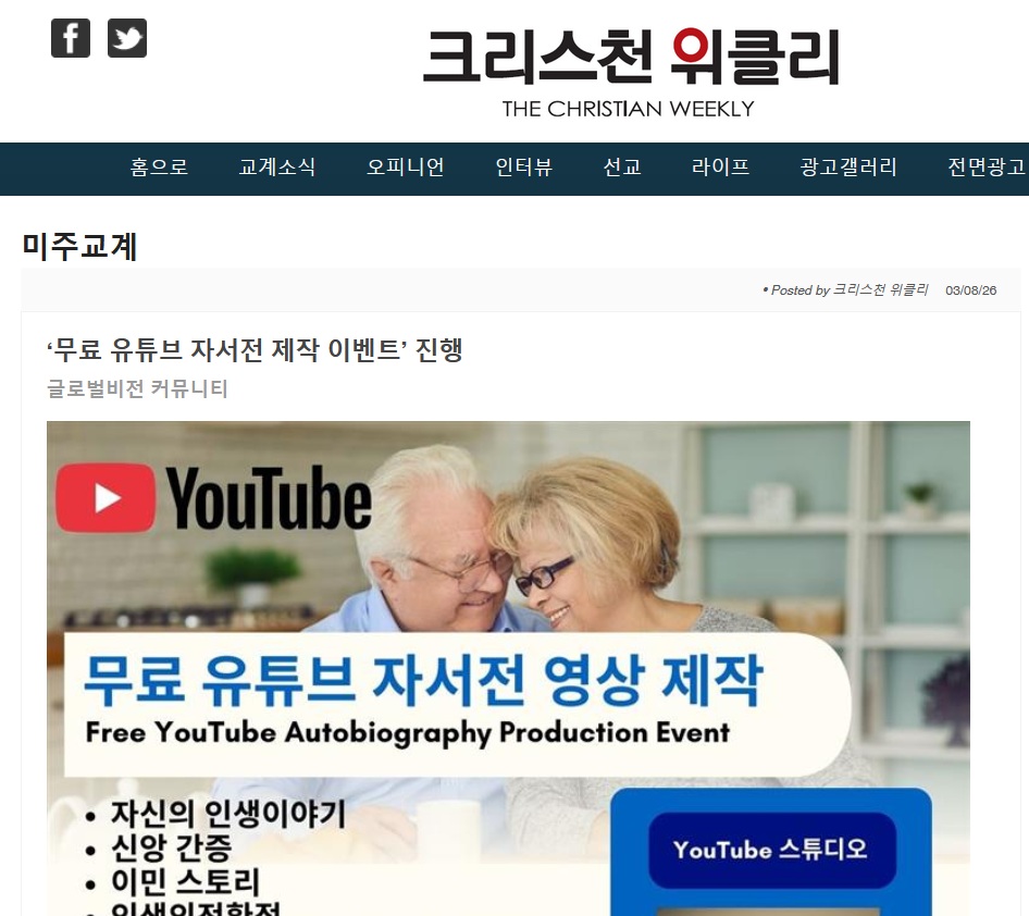 [크리스천 위클리]‘무료 유튜브 자서전 제작 이벤트’ 진행