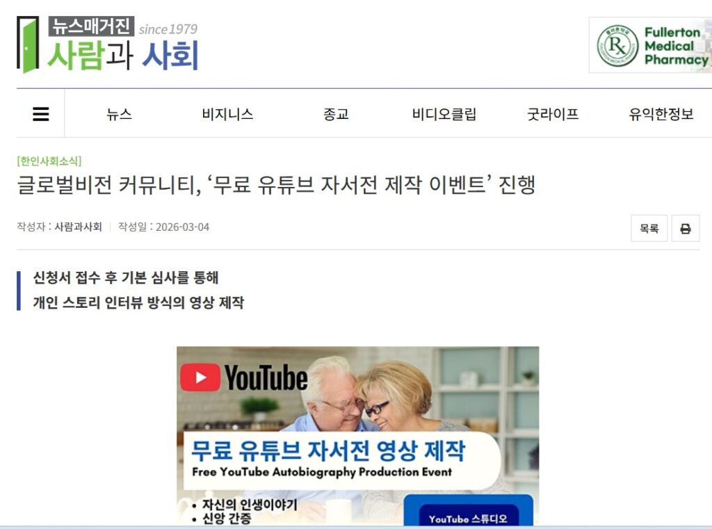 글로벌비전 커뮤니티 <CA> 글로벌비전 커뮤니티(대표 제임스 구)는 개인의 삶과 이야기를 영상으로 기록하는 “무료 유튜브 자서전 영상 제작 이벤트”를 진행하고 있다. […]